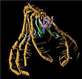 The animals preserved are primarily epibenthic [organisms living at the surface of the sea bed or lake floor], but infauna [aquatic animals living within the matrix of bottom sediment] and nektobenthic [marine life that exist just above the ocean bottom and occasionally rest on it] forms are also represented. The fossils are preserved as three dimensional calcite void-fills in carbonate nodules and are impossible to extract by standard methods. We heard that the specimens are studied using tomographic techniques to produce high fidelity three-dimensional virtual fossils that yield a wealth of palaeobiological information. By taking the specimen, slicing it at 20 micron intervals and recording each image, a three-dimensional computer realisation of the animal is made (see images for examples).