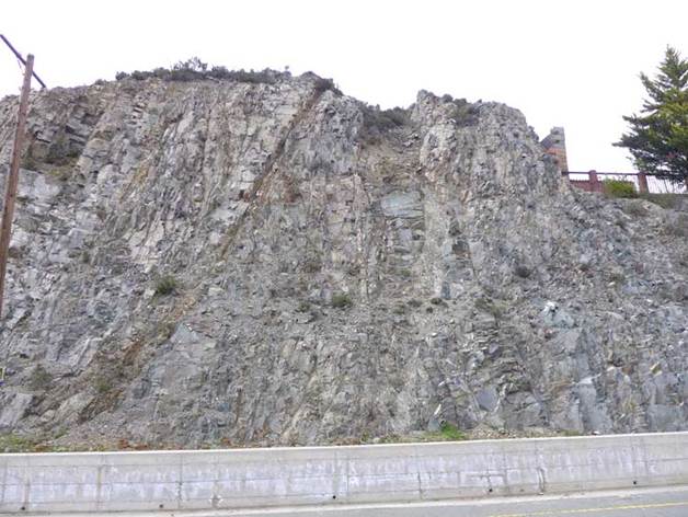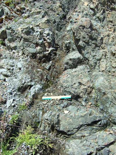Dykes were evident on close identification. A darker coloured, more vertical feature ascending the exposed section was identified as a conduit, a component of hydrothermal plumbing. It was a feeder conduit for a black smoker vent. Hydrothermal fluids formed when seawater circulated through oceanic crust and became superheated at high pressure. The violent circulation of hydrothermal fluids caused brecciation of dykes with mineralization, the process by which rock is impregnation with minerals. Quartz and bright green epidotes were the main minerals formed. Sulphides were also precipitated from solution. Chalcopyrite (copper pyrites) and pyrite (fools' gold, iron sulfide) mineralization also occurred in veins.