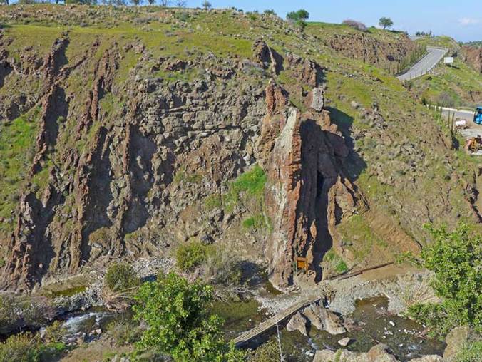 Moving on in our coach into igneous rock territory we observed pillow lavas on the roadside. "If there is no traffic it will be ok", said Paul as the coach climbed, passing sheeted dykes up to a high pass, followed by a spectacular descent through wild mountain countryside with purple saxifrage clinging to rock faces. The mountain scenery was formed by erosion during the Miocene, a period of very high rainfall. There was applause for Andy as we "landed'' safely at our next site. Was this the first ever crossing of the pass by a 50-seater coach?