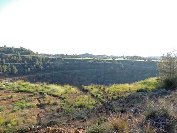 Mining for copper on a small scale dates back to the Roman occupation. This open cast mine was enlarged between 1920-1940s and has been made safe for public access. The Phoenicians also mined copper on the island and depleted the forests using the wood to extract the metal from ores, a process known as refining. Numerous slag heaps indicated that copper ores were smelted on site. The ores formed in the final stage of black smoker activity when seawater percolated through fractures in pillow lavas and formed exhalative sulfide mineral deposits. A silvery specimen of marcasite, a polymorph of pyrite (FeS2) was found though it is rare in hydrothermal deposits and more common in sedimentary rocks. Sulphuric acid is a by-product formed by oxidation of sulfides to sulphate and is potentially harmful to the environment (acid rock/mine drainage). Gypsum (calcium sulphate) formed as a secondary mineral by reaction between carbonates and the acid. For further details on hydrothermal processes and mineralisation there is more information on the Internet under ''pillow lava mineralisation (Cyprus)".